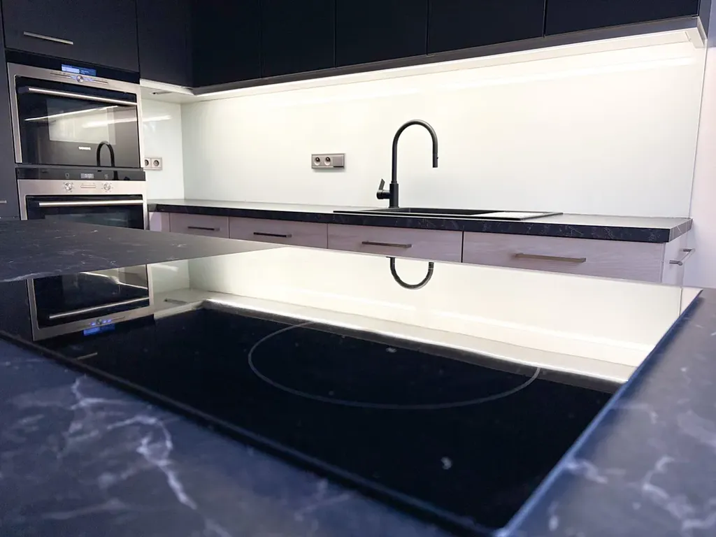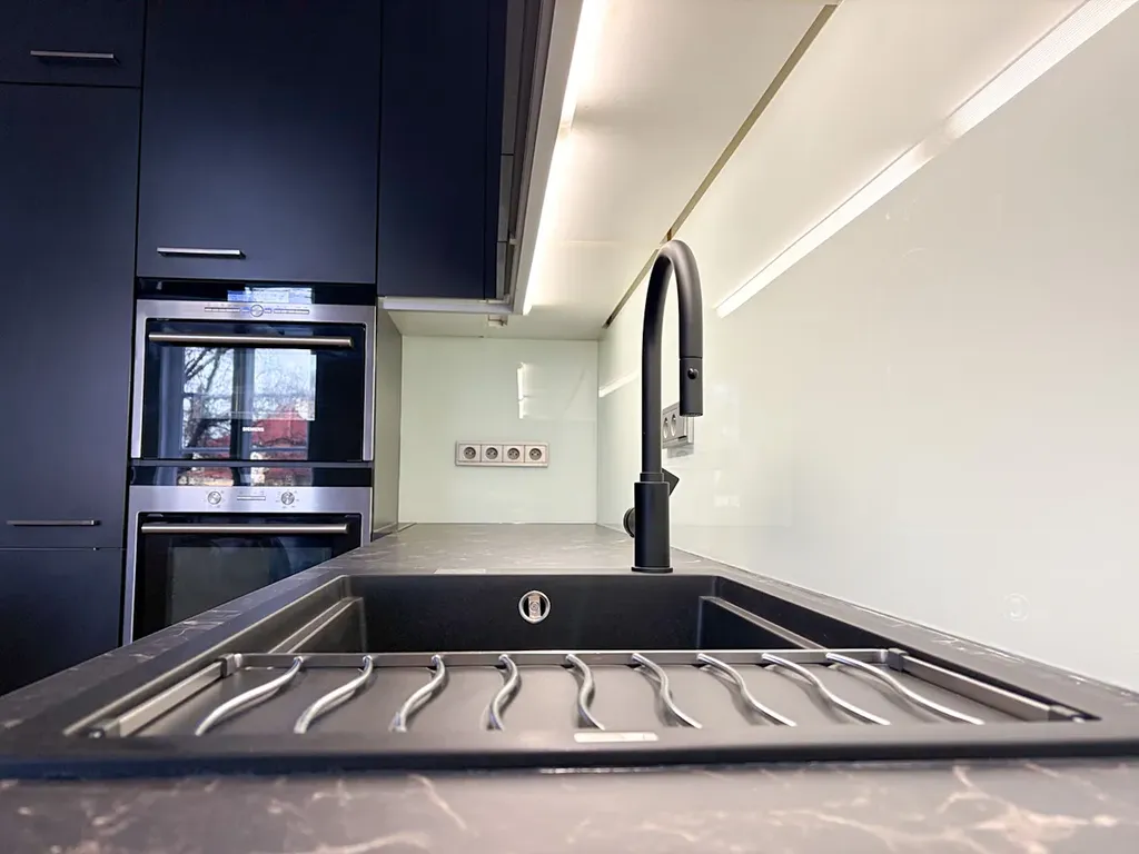 - Kuchyně: Plně vybavená kuchyňská linka s ostrůvkem a vestavěnými spotřebiči (varná deska, trouba, mikrovlnná trouba, myčka, lednice, digestoř s odtahem).