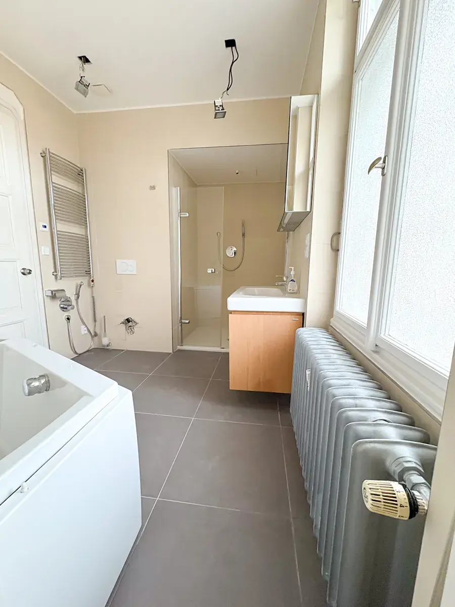 - Podlahy: V pokojích jsou klasické parkety, v zázemí (koupelna, WC, prádelna) dlažba.