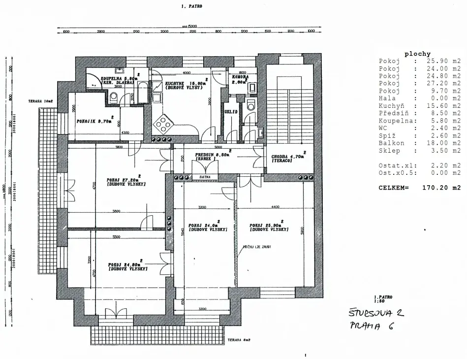 Dispozice a vybavení: Byt nabízí čtyři velké pokoje, jeden menší pokoj, kuchyni, koupelnu, samostatné WC, šatnu, prádelnu, předsíň a dva balkony.