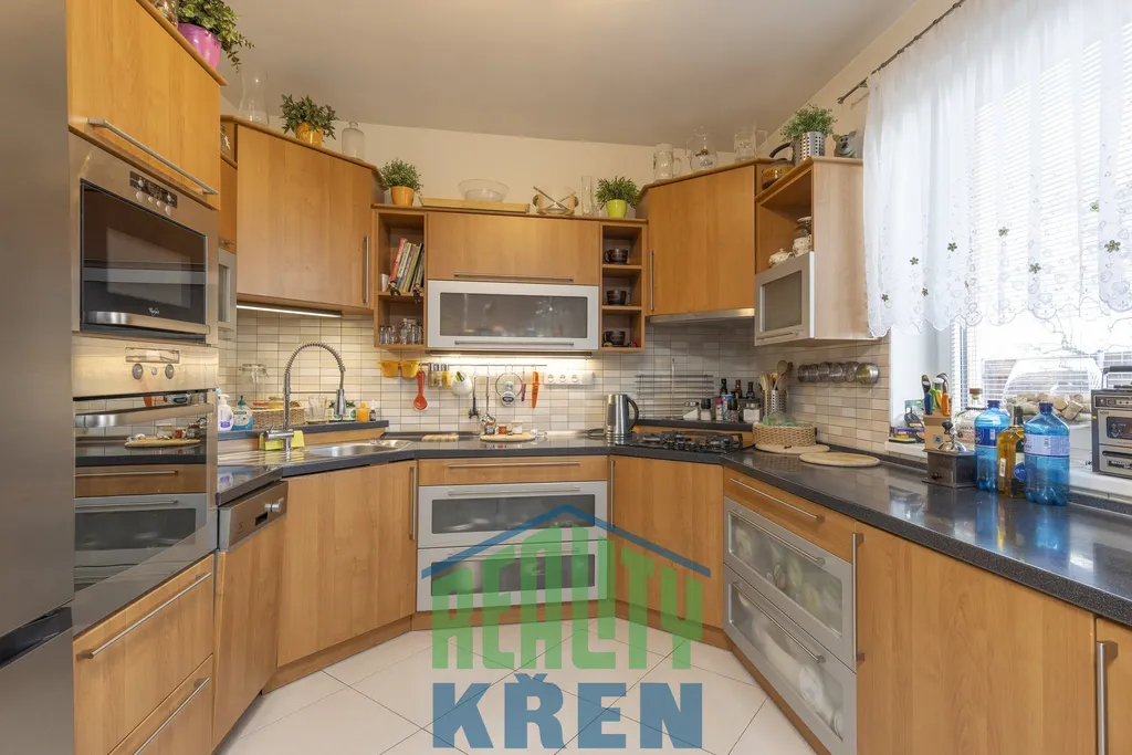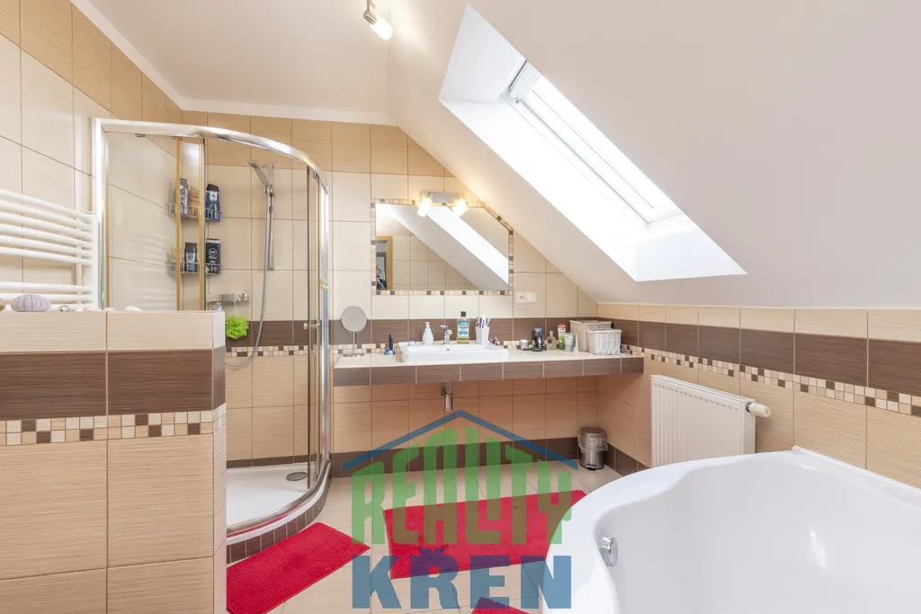 Prodej RD 4+1, 151 m2, s terasou a garáží, ulice V Topolech, Unhošť. Vstupní předsíň s vestavěnými skříněmi, obývací pokoj s krbovými kamny a vstupem na terasu a zahradu, kuchyně s vestavěnými spotřebiči, spíž, koupelna se sprchovým koutem a WC, schodiště do patra, kde se nachází 3x ložnice, koupelna se sprchovým koutem, vanou a WC.