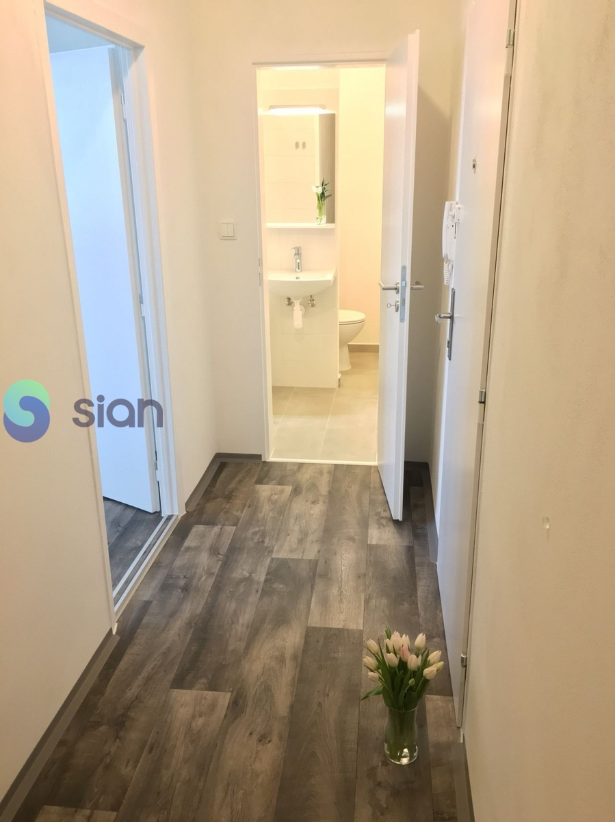Byt je po rekonstrukci a má vyzděné jádro, podlahy, rozvody, omítky, interiérové dveře. Koupelna s vanou a umyvadlem s osvětlením, toaleta je součástí koupelny oddělená přepážkou. Kuchyňská linka je opatřena plynovým sporákem a elektrickou troubou s možností připojení pračky.