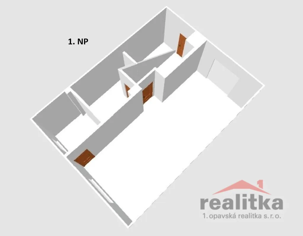 předsíň, obývací pokoj s kuchyňským koutem, pracovna, koupelna s vanou a WC.