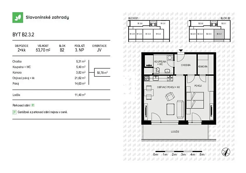Byt B2.3.2 o dispozici 2+kk má podlahovou plochu 53,7 m², terasa o velikosti 11,4 m² a nachází se ve 3.NP bytového domu s nízkým počtem bytových jednotek.