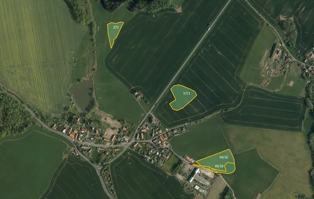 Předmětem prodeje je v KÚ Starý Dvůr vlastnictví půdy na parcelách č. 57/3, 49/26, 49/16, 338 a 49/28 zapsaných na listu vlastnictví 527.