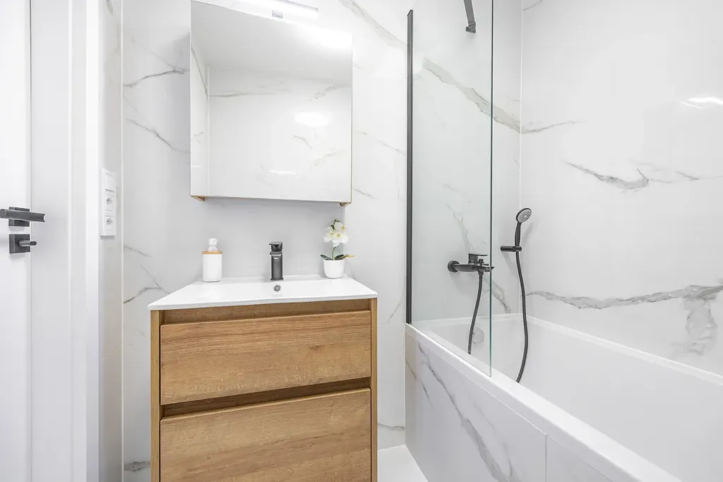 - novou sanitu (vana, sprcha, WC, umyvadlo, skříňka, topný žebřík)