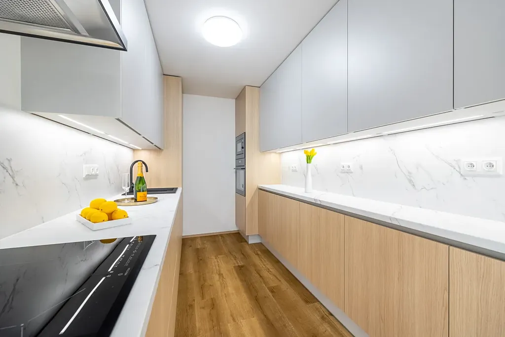 Byt odpovídá fotografiím – nejedná se o vizualizaci. Kuchyně je vyrobena na míru a plně vybavena spotřebiči (elektrická trouba, indukční varná deska, mikrovlnka, myčka, digestoř). Spolu s prostorným obývacím pokojem tvoří příjemný a moderní společenský prostor.