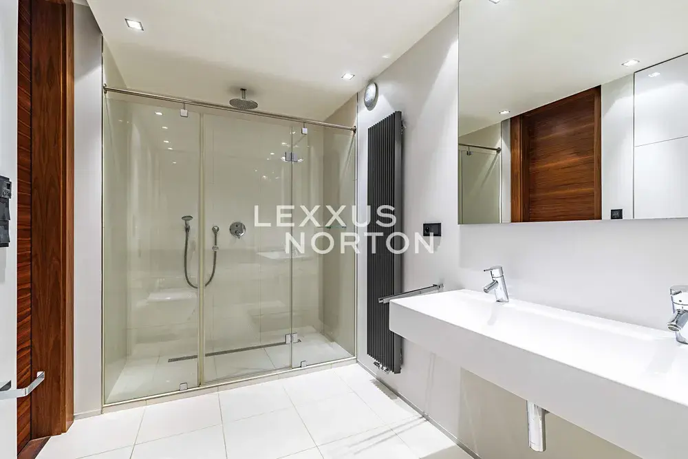K vybavení kompletně zařízeného bytu patří ořechové podlahy, vestavěné skříně s dostatkem úložného prostoru, pračka a sušička. Samozřejmostí je podlahové vytápění, alarm a videotelefon. První koupelna je vybavena vanou, dvojumyvadlem, toaletou a bidetem, druhá pak nabízí prostorný sprchový kout s dvojumyvadlem.