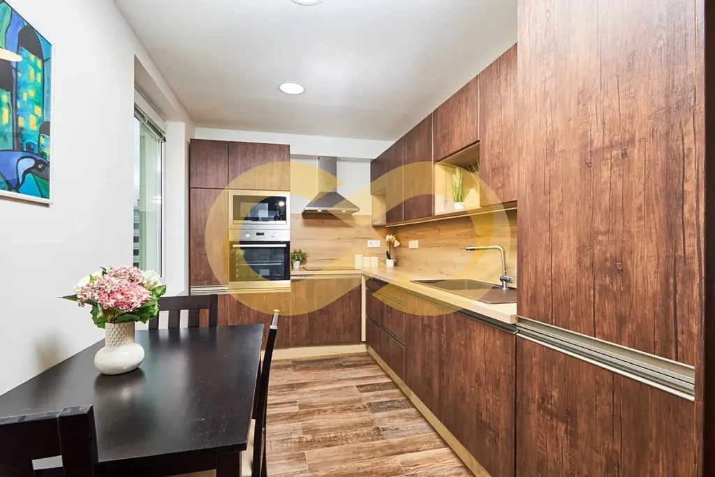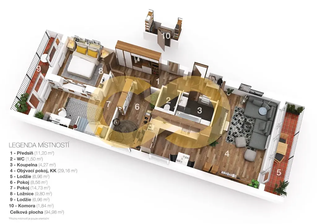 Byt má dispozici 4+kk a celkovou výměru 94 m² . Je tu velký obývací pokoj s kuchyní, tři pokoje, koupelna, oddělené WC a na chodbě komora. A to nejlepší? Dvě velké zasklené lodžie.
