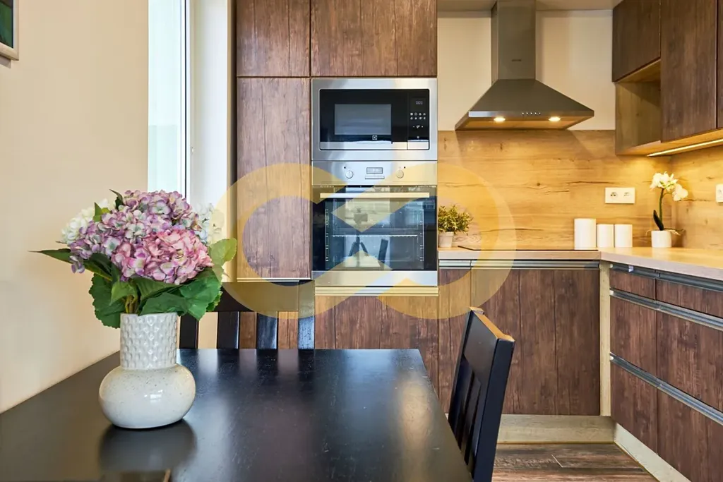 Kuchyně s moderní linkou je prakticky schovaná za rohem, takže při večerním posezení v obýváku vás nebude rušit výhled na špinavé nádobí.