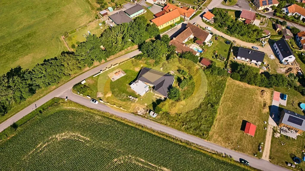 Stavební pozemek má výměru 3 700 m² a můžete ho využít celý, nebo rozdělit na dvě samostatné stavební parcely. Na větší části o velikosti 2 200 m² už stojí rozestavěný dům ve fázi hrubé stavby s užitnou plochou 180 m² a dispozicí 4+kk.
