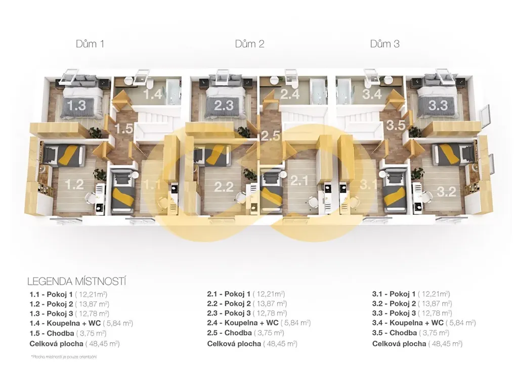 Byty jsou dvoupodlažní – v přízemí je obývák s kuchyní, technická místnost a samostatná toaleta, v patře jsou tři ložnice a koupelna s WC.