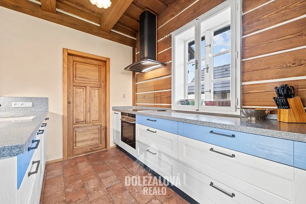 • Kvalitní vybavení – kuchyně Sykora, spotřebiče Siemens/Miele, kachlová kamna, podlahové topení IVAR, plynový kotel Geminox.
