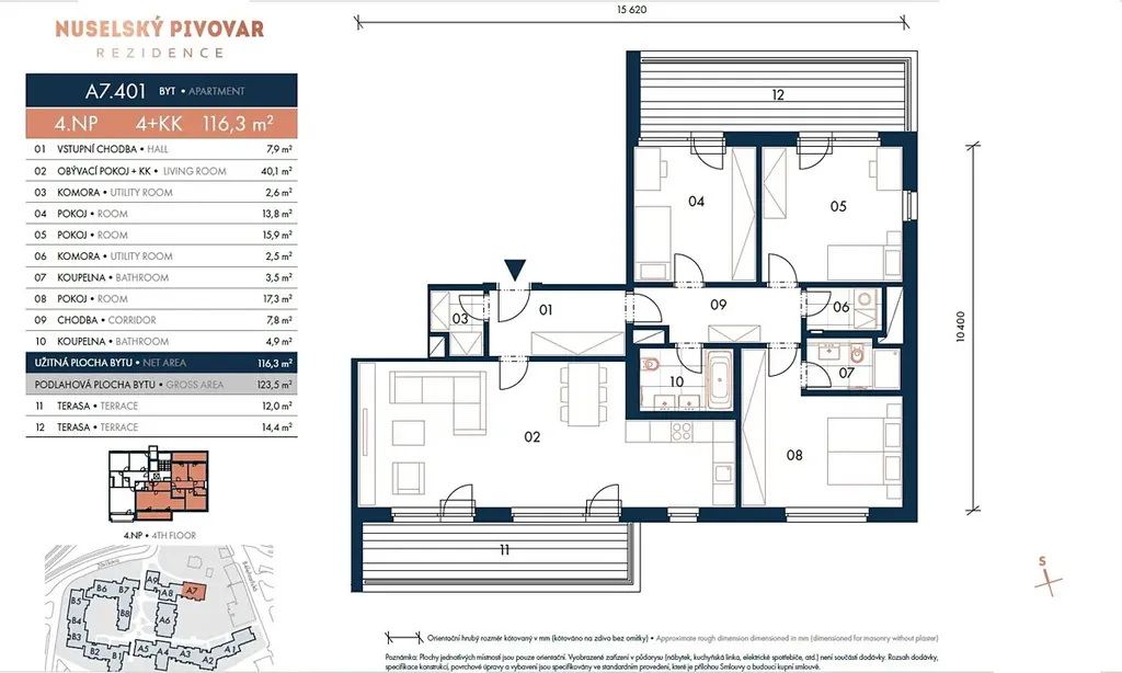 Byt je dispozičně řešen jako 4+kk, nachází se ve 4. podlaží, čistá obytná plocha 116,3 m2 + dvě regulérní ničím nestíněné terasy 12m2 a 14,4 m2. K dispozici jsou, kromě velkého obývacího pokoje s kuchyňským koutem a vstupem na jižní terasu, tři samostatné ložnice, z toho dvě s přístupem na terasu severovýchodní, dvě prostorné koupelny, jedna se sprchovým koutem a toaletou a druhá s vanou, dvěma umyvadly a toaletou. Dále je v bytě samostatná místnost pro praní, sušení a uložení prádla a samostatná toaleta, také je k dispozici velké garážové stání a velký sklep 5,6 m2. Je možné si pronajmout ještě druhé velké parkovací stání vedle. Byt je částečně zařízený novým vybavením, které je vidět na fotografiích.