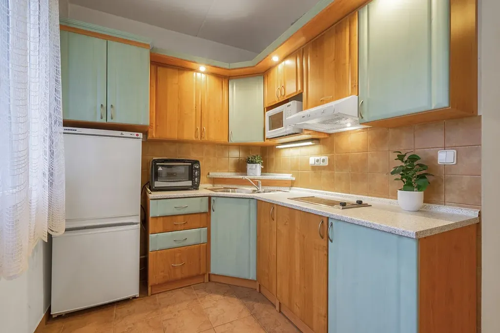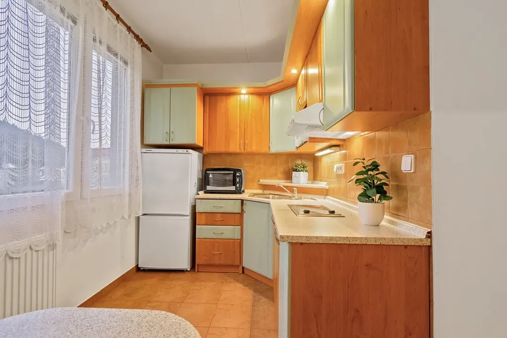 Bytová jednotka prošla kompletní rekonstrukcí - plastová okna, nové koupelnové jádro z Ytongu, nové rozvody IS (elektřina, odpady, voda), v celém bytě byla zvolena jako podlahová krytina dlažba, v pokoji jsou na míru zhotovené skříně se zabudovanými dvěma sklopnými lůžky a ve stejném dekoru pracovní stůl.
