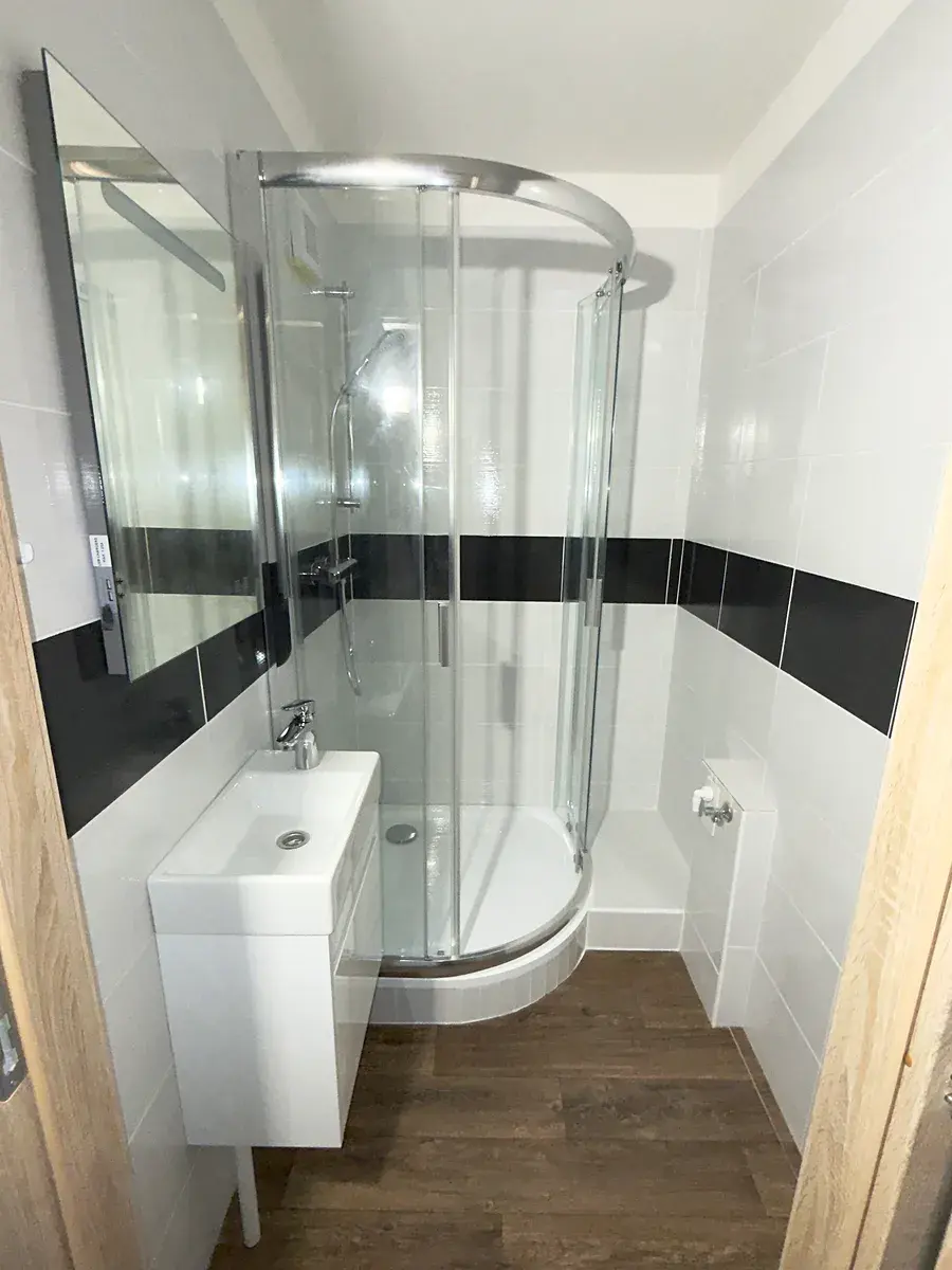 Koupelna je zcela nová, vybavená sprchovacím koutem, umyvadlem s koupelnovou skříňkou, osvětleným zrcadlem a nechybí zde ani přípojka na pračku.