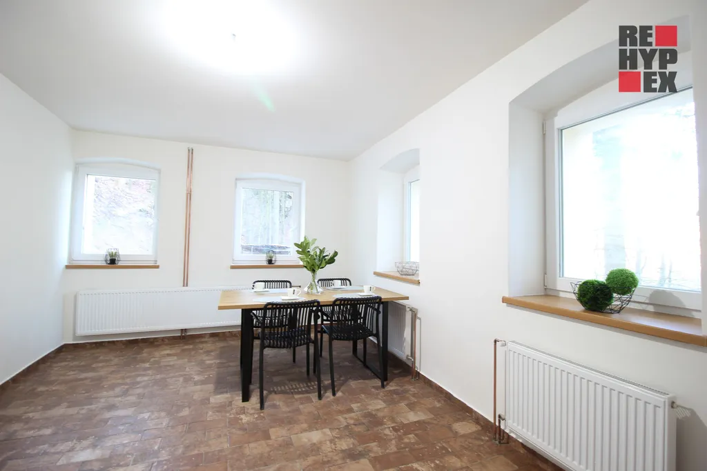 Dispozice domu je 4+kk. V přízemí se nachází komora (spíž), samostatné WC, prostorná kuchyně, předsíň a sklep s klenutým stropem z kamene. V prvním patře naleznete útulný obývací pokoj a pracovnu (obě místnosti s přípravou na kamna), dále pak prostornou koupelnu s luxusní rohovou vanou, bojlerem, závěsným WC Geberit, přípravou pro pračku a myčku. Třešničkou na dortu je rozsáhlý podkrovní prostor, který lze buď ponechat v současné podobě nebo jednoduše přepažit na několik menších pokojů dle přání majitele.