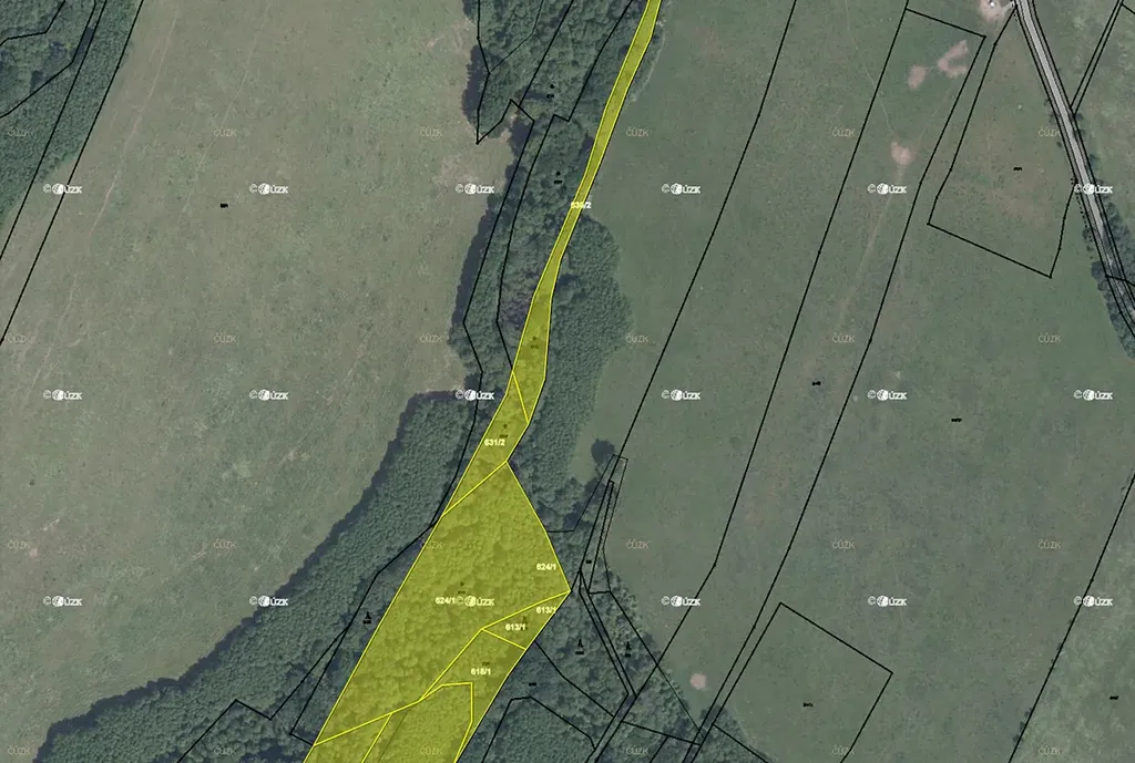 Pozemky patří pod LV: 661 a 697 (o podílu 1/6), parcelní číslo: 600/9, 600/10, 603/1, 605, 609, 613/1, 616/1, 617/1, 618/1, 624/1, 630/2, 631/2.