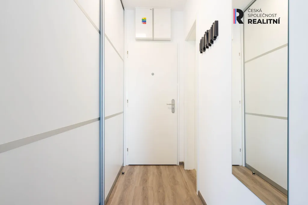 Bytová jednotka je dispozičně řešena vstupní chodbou s vestavnou skříní v níž je umístěna pračka a sušička, velký obytný pokoj s kuchyňským koutem a prostorem pro plnohodnotnou ložnici a koupelnou se sprchovým koutem a toaletou.