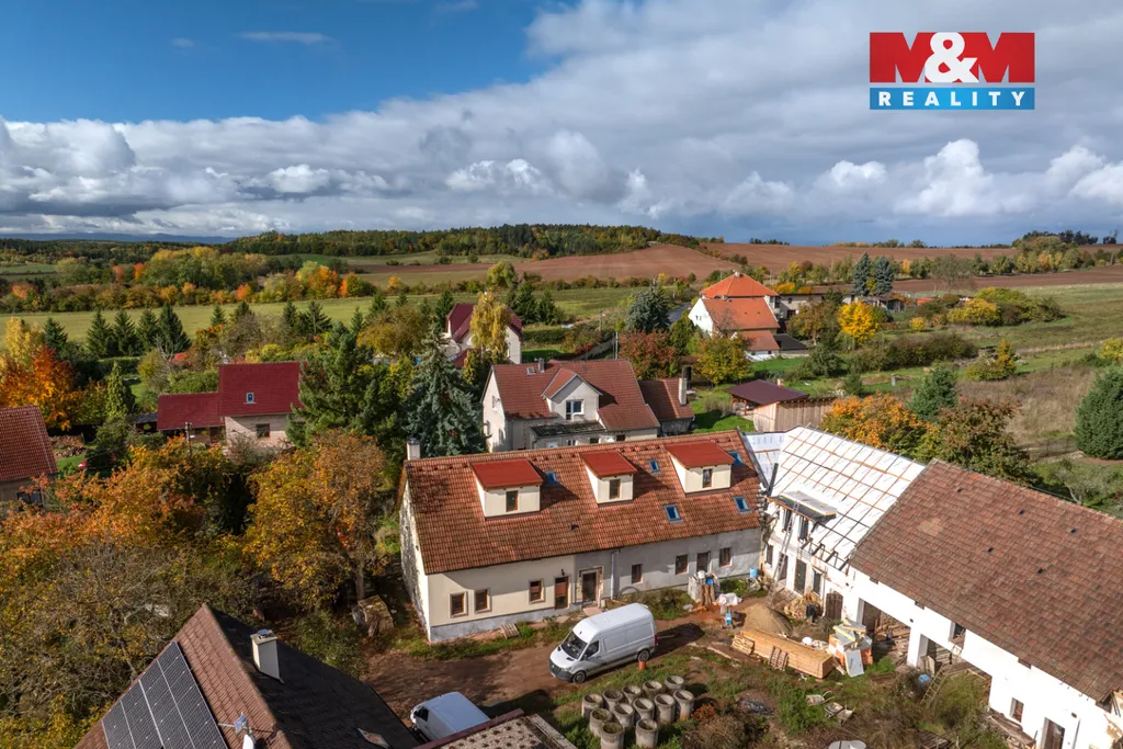 Tento podkrovní mezonetový byt se nachází ve 2. a 3.NP rekonstruovaného domu, ve kterém je více bytů venkovského stylu. Spodní podlaží bytu má 19 m2 a je tu vstupní chodba, obývací pokoj s kuchyňským koutem, WC s umyvadlem a místem pro pračku, je zde jedno střešní okno. V podkroví o velikosti 18,5 m2 je pak otevřená ložnice, ve které bude volně stojící vana s krásným výhledem vikýřem do přírody, dále umyvadlo a komora. Orientace bytu je východ a západ. Dům je zateplen, na střeše jsou nové betonové tašky, PENB typu B. Nízké náklady na energie a vodu. Topení a teplá voda je tepelným čerpadlem, vytápění v podlaze. Voda obecní vodovod, splachování dešťovka. Okna plastová, trojsklo. V domě je bezdrátový internet a společná anténa. Součástí kupní ceny jsou: podlahy, zárubně, dveře, koupelna vč. obkladů, sanity. Ve dvoře objektu bude park s lavičkami a herními prvky pro děti, dále wellness. Parkování zajištěno, možnost i dokoupení garáže. Byt číslo 8.