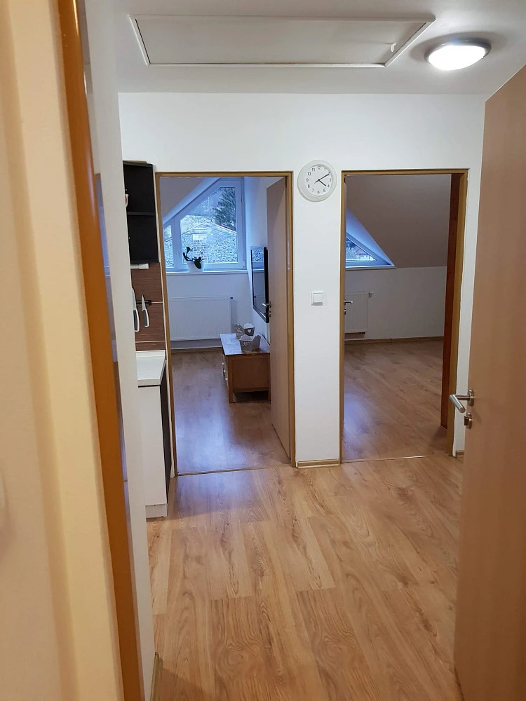 První pokoj je s postelí, skříní a jídelním stolem. Druhý pokoj je s manželskou postelí, dvě skříně a komoda. Třetí pokoj je obývací částí se sedací soupravou, televizi, dvě křesla. Pokoje jsou neprůchozí. Kuchyně je vybavena kuchyňskou linkou se sklo-keramickou deskou, dřezem, lednicí a myčkou. Okna jsou zde řešena formou odhlučněných plastových střešních dvojskel.