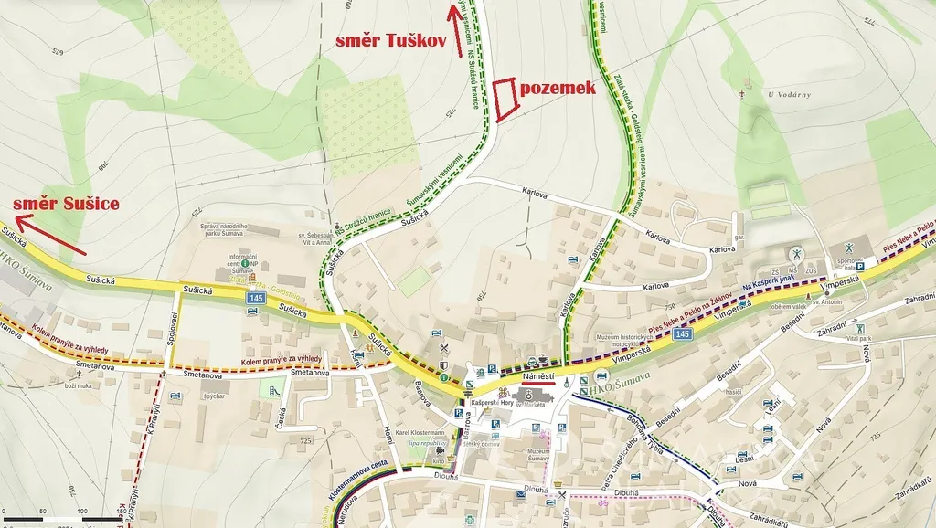 Hezká poloha je největší předností této nabídky. Pozemek je koncový, svažuje se od své horní hranice ke komunikaci, z níž lze řešit pohodlné komunikační napojení. Hraničí s okrajem městské zástavby a vzdálenější hranice už sousedí s volnou krajinou. Největší předností je výhled orientovaný západně do volné krajiny na vzdálené šumavské vrcholy. Jde o klidné místo pár minut pěší chůze od náměstí. Velkorysý prostor pro umístění stavby, klidné místo i výhled podtrhují spojení s mysticky krásnou šumavskou krajinou.