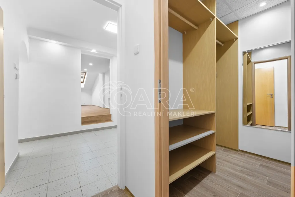 Další dva menší pokoje jsou ideální jako ložnice, dětský pokoj, pracovna či pokoj pro hosty, přičemž jeden z nich nabízí praktický úložný prostor v podobě patra. K jedné z ložnic náleží také samostatná šatna.Byt disponuje dvěma koupelnami vybavenými vanou, sprchovým koutem a toaletou, dále je k dispozici samostatná toaleta. Pračka je součástí vybavení.