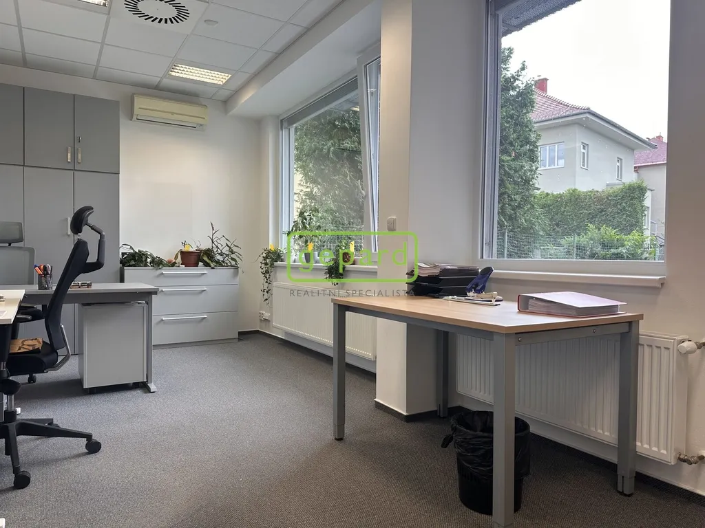 Nabízíme k pronájmu prostorné a reprezentativní kancelářské prostory o celkové podlahové ploše 100,3 m2 m2, plus sdílené prostory o ploše 30,16 m2 na klidné ulici Kořenského v Brně - Řečkovicích. Přímo na ulice jsou stále volná místa k parkování, dále je možno pronajmout 2 parkovací místa doslova na očích z jedné pronajaté kanceláře. Kancelářské prostory se nachází ve přízemí nově zrekonstruovaného cihlového polyfunkčního domu, kde sídlí významná nadnárodní firmy, která přenechává část svých prostor. Z obdélníkového vstupního prostoru vedou dveře do jednotlivých kanceláří, do kuchyně a na WC. Celkem se jedná o pět kanceláří o rozměrech 19,87 m2, 21,11 m2, 21,39 m2 a 17,85 m2. Dále k pronájmu je možné využívat sdílené prostory - zasedací místnost 13,62 m2, kuchyň 10,54 m2 a WC. Ke kancelářím je možné pronajmout 2 parkovací stání, která jsou v těsné blízkosti bytového domu, ihned vedle jedné z kanceláří. V ceně pronájmu je úklid zajištěný externí firmou. Více informací poskytne makléř Aleš Kavín