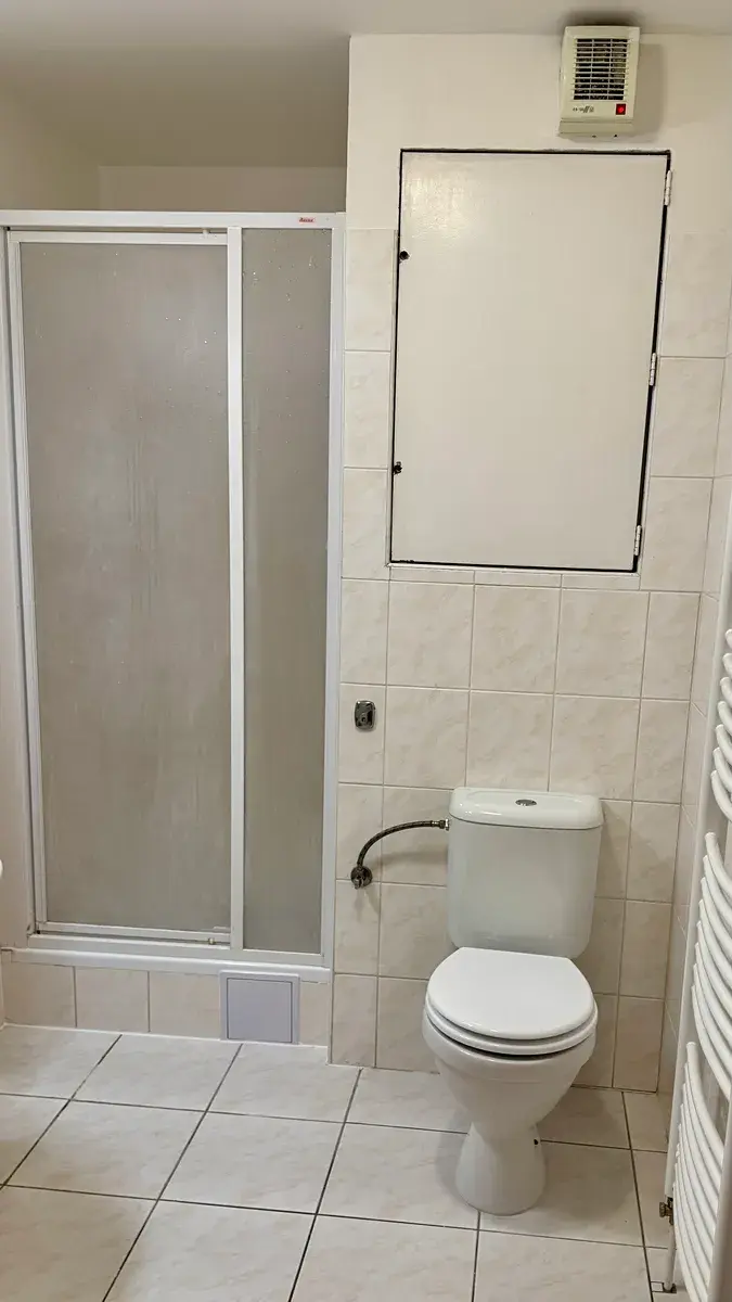Za vstupem do bytu najdete prostornou předsíň s vchodem do koupelny se sprchovým koutem a WC a vstup do pokoje s kuchyňskou linkou a balkonem.