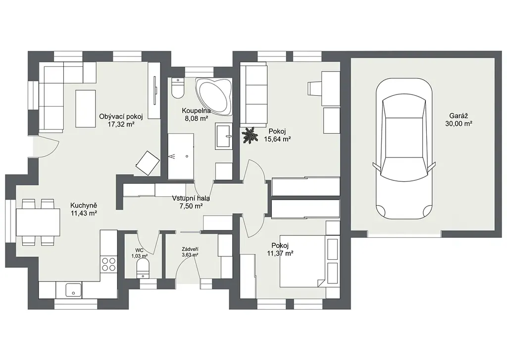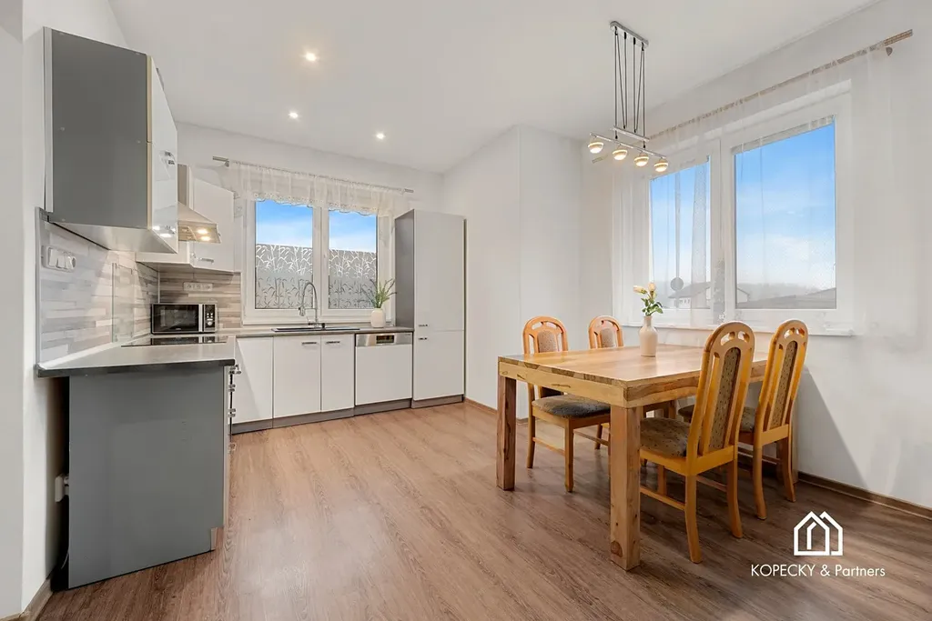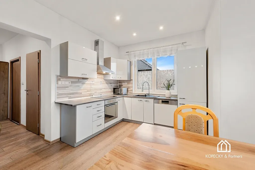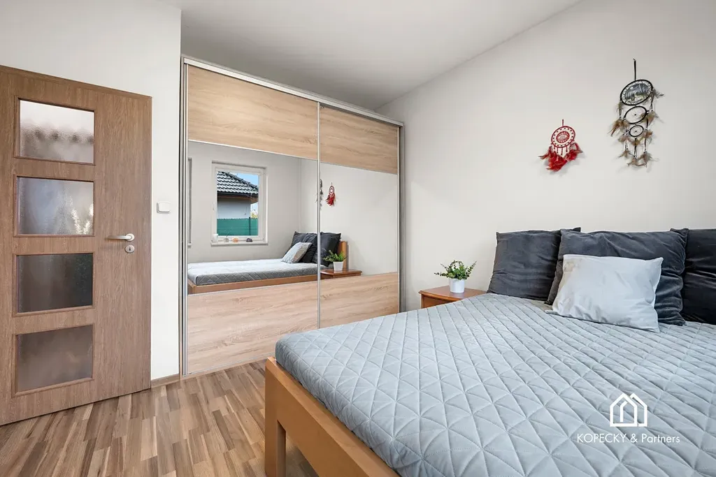 Interiér působí čistě, funkčně a je ve velmi dobrém stavu. Obývací pokoj je propojený s kuchyní a nabízí přímý vstup na terasu, což vytváří plynulý přechod mezi interiérem a zahradou. Dům disponuje ložnicí, dětským pokojem, koupelnou s vanou i sprchovým koutem a samostatným WC. K dispozici je také zateplená půda o výměře 12 m² vhodná jako úložný prostor.