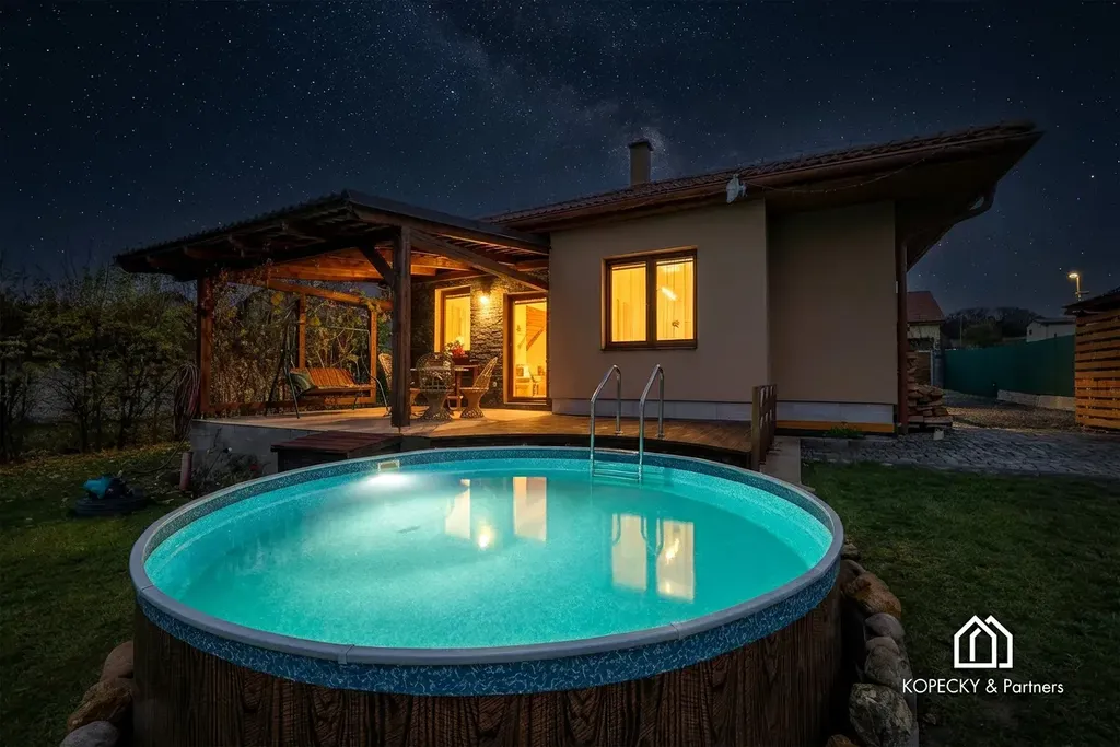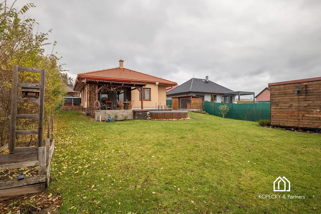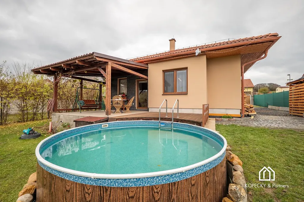 Dům s dispozicí 3+kk je umístěný na rovinatém pozemku o velikosti 678 m², který je kompletně oplocený a vybavený bránou na dálkové ovládání. Kromě garáže o ploše 30 m² nabízí pozemek také dostatek prostoru pro parkování dalších vozidel. Jižní orientace zahrady zajišťuje celodenní světlo, příjemnou atmosféru a komfort při každodenním užívání. Součástí je terasa navazující na obytnou část domu a venkovní bazén.