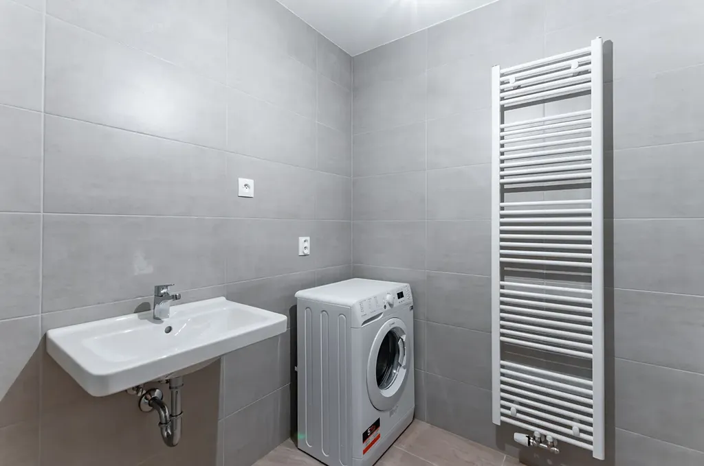 V předsíně je instalovaná šatní skříň. Koupelna se sprchovým koutem, WC a pračkou.