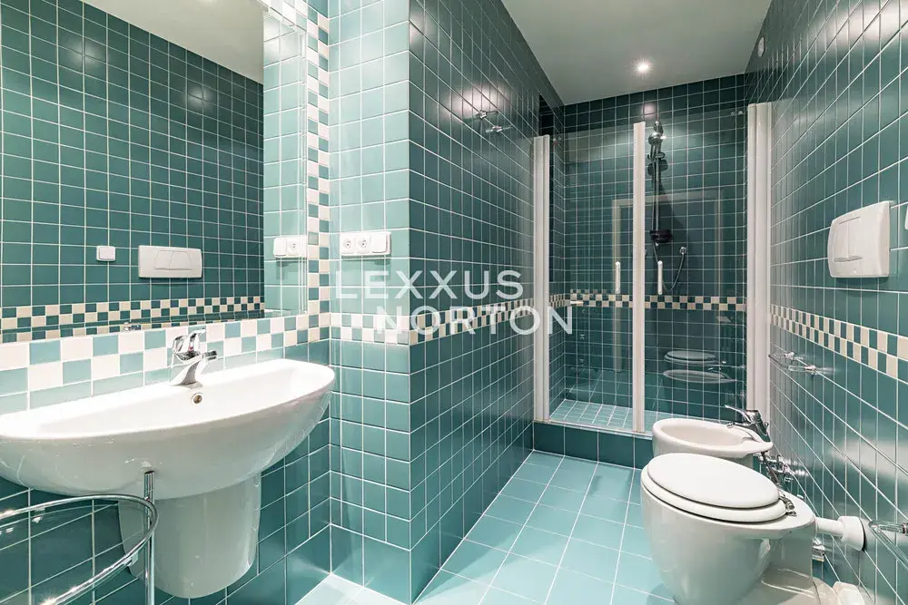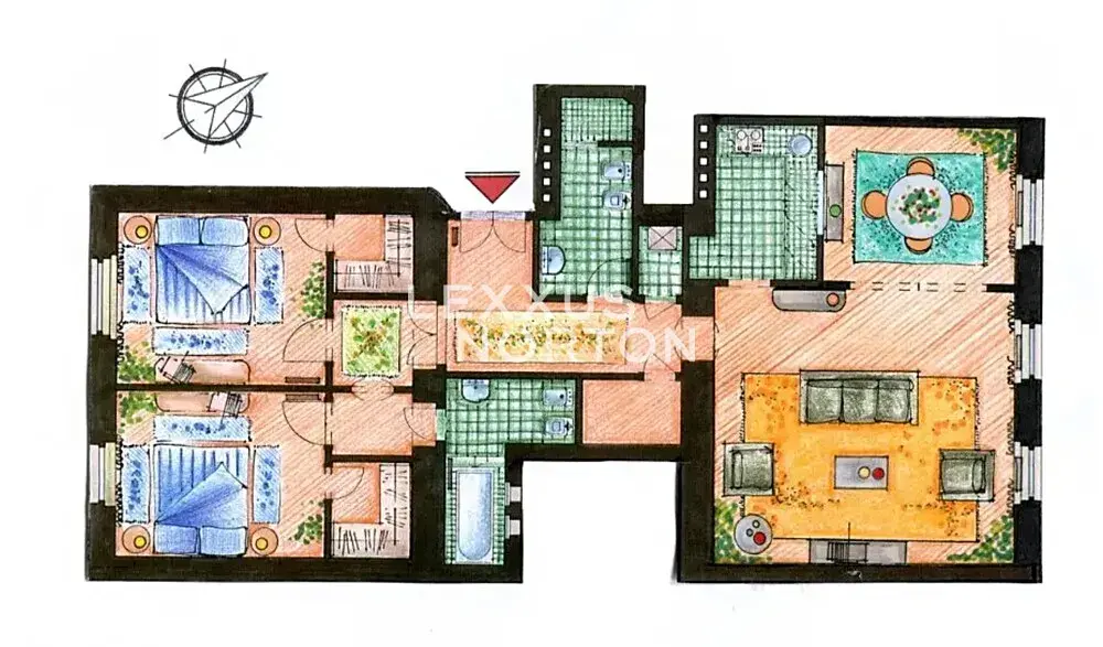 Interiér bytu tvoří vstupní hala, vzdušný obývací pokoj, kuchyň, dvě útulné ložnice, dvě koupelny (vana, sprchový kout, toaleta a bidet), dvě šatny a dvě komory.