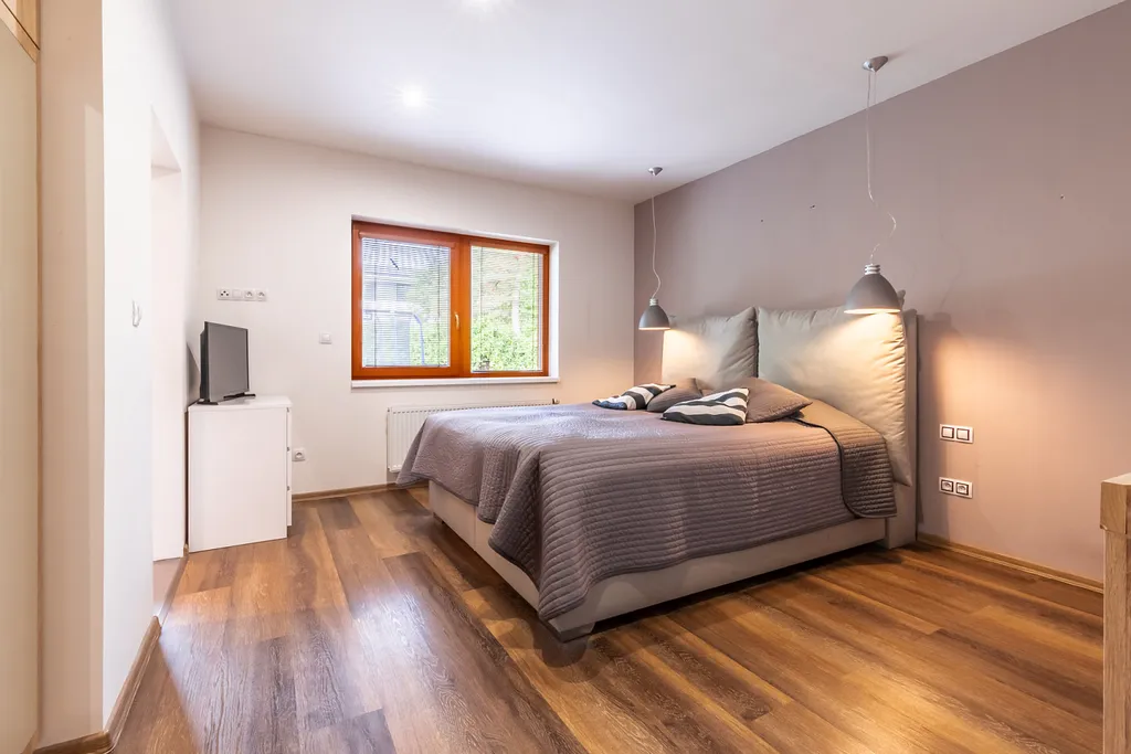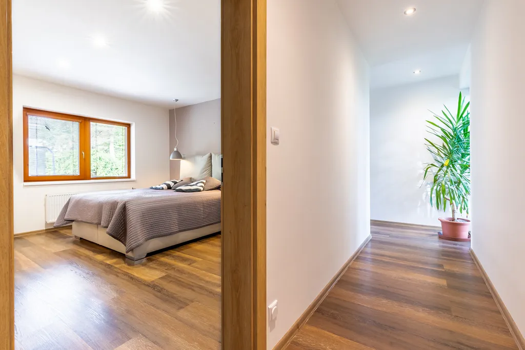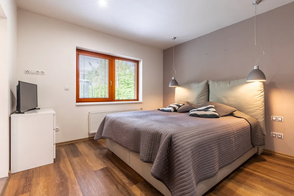 Dispozice domu - 1.PP - hlavní vstup/zádveří, hala se schodištěm, technická místnost, sklad a prostorná garáž. 1.NP - obývací pokoj ze kterého je francouzskými okny zpřístupněna pobytová terasa (31m²) a následně vstup do zahrady. Dále je zde kuchyňský kout s jídelnou, rodičovská ložnice s koupelnou s vanou, umyvadlem a WC. Dále se zde nachází dva dětské pokoje a druhá koupelna s WC. Z chodby je vstup do půdního prostoru (další úložný prostor). Dům byl kolaudován v roce 2015 a je ve velmi dobrém technickém stavu. K domu patří krásná a udržovaná zahrada se vzrostlými stromy, s altánem a bazénem. Dům je napojen na vlastní čistírnu odpadních vod, obecní vodovod, má však i vlastní studnu. Obecní kanalizace na hranici pozemku. Vytápění domu je řešeno plynovým kotlem.