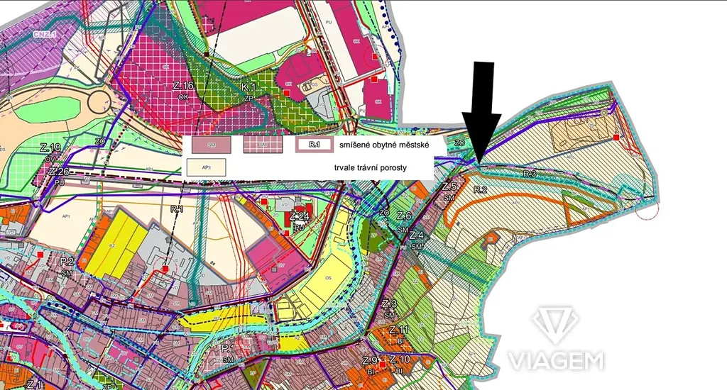 Pozemky jsou z části 3.200 m2 návrh na smíšené městské - bydlení v bytových a obytných domech, výšková hladina 4 nadzemní podlaží.