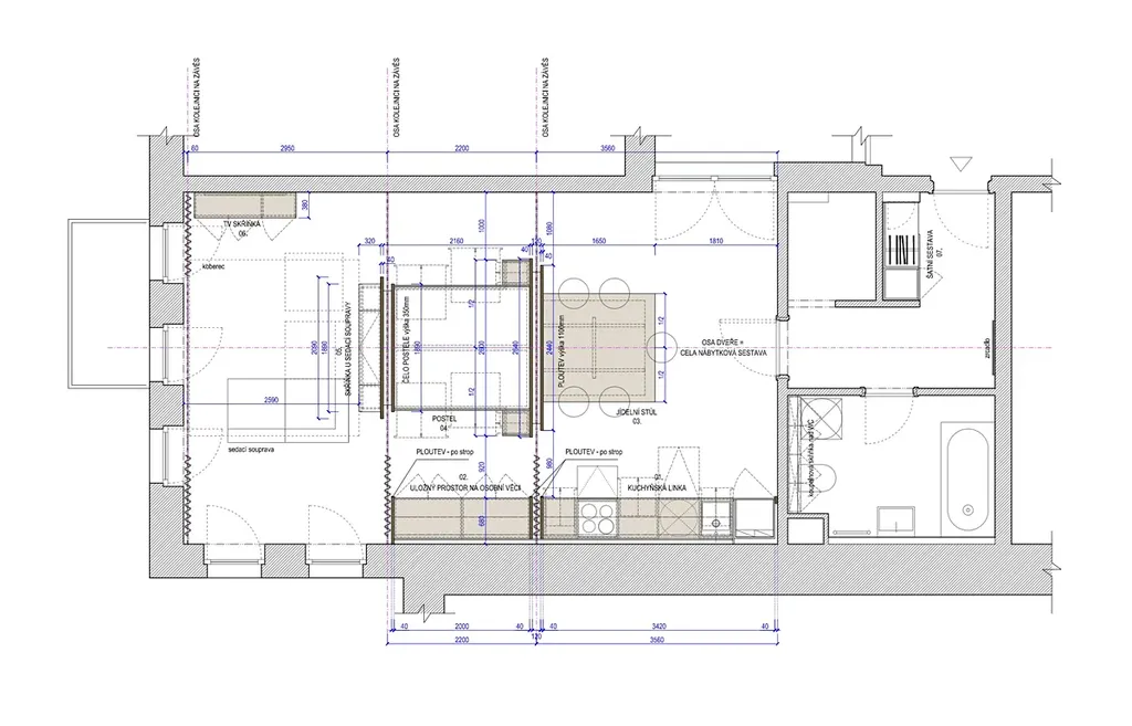 Hlavní obytná část je navržena jako jeden otevřený celek, který je chytře zónován pomocí nábytkové příčky a závěsů. Díky tomu nabízí jasně oddělenou obývací část, spací zónu a kuchyň s jídelním stolem, aniž by prostor působil přeplněně či uzavřeně. Velkoformátová okna zajišťují dostatek denního světla a opticky prostor zvětšují.