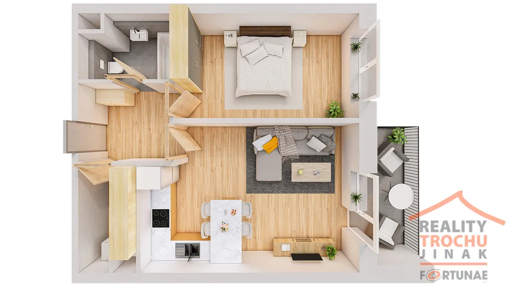Obývací pokoj s kuchyňským koutem, ložnice, koupelna s WC, šatna (komora), předsíň.