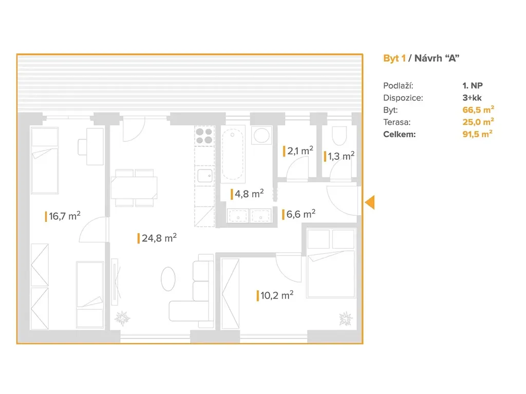 / Byt 1: 2+1 s terasou / 1. NP / výměra 66 m² + terasa