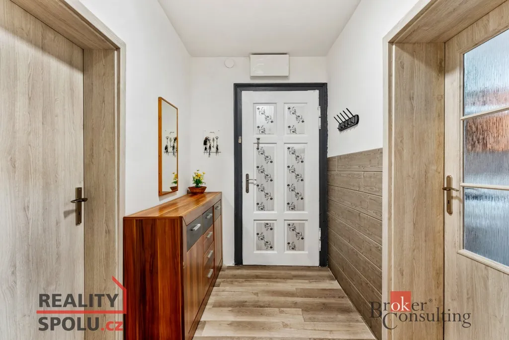 Samotný dům má dvě nadzemní podlaží, půdní prostor a dva sklepy. V přízemí najdeme dvě samostatné bytové jednotky 2+kk, oddělené společnou chodbou, kde je také umístěn kotel na tuhá paliva pro vytápění celého objektu. V patře se nachází další byt 2+kk a několik místností se vstupem na půdu – ideální prostor pro vestavbu dalšího bytu.