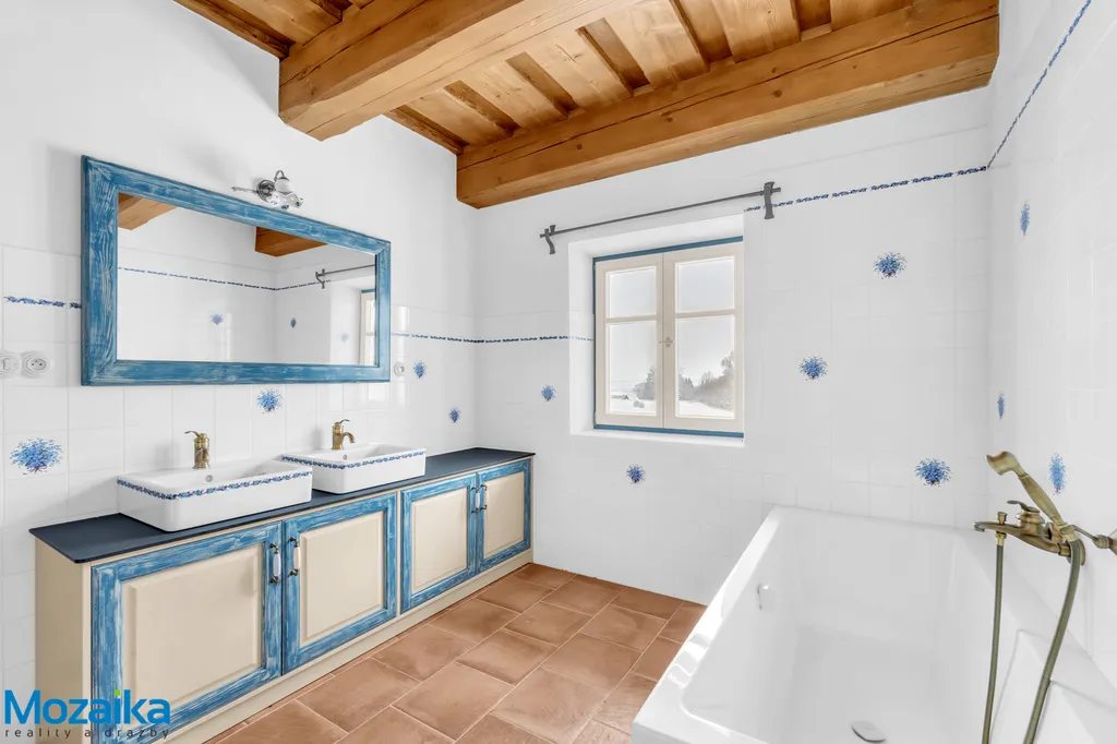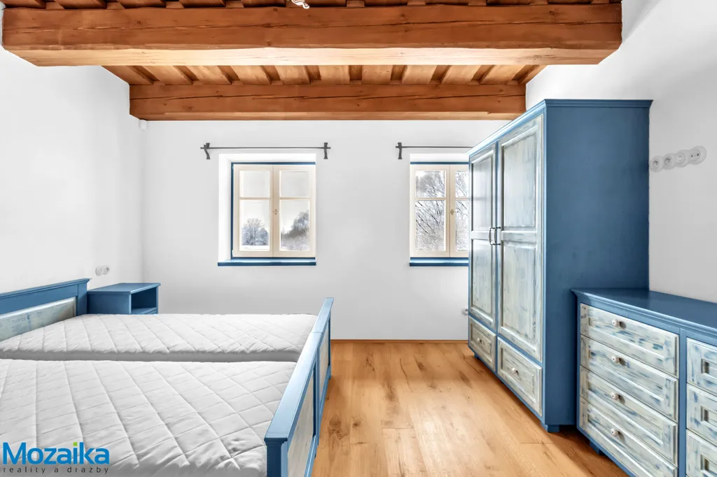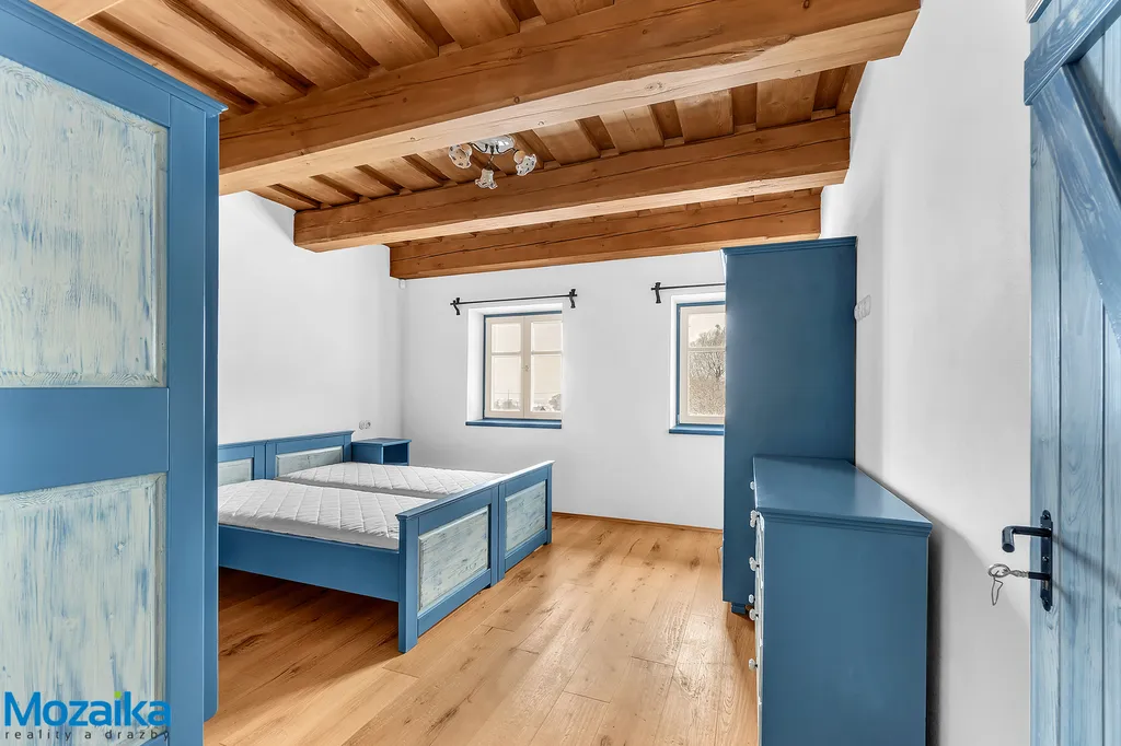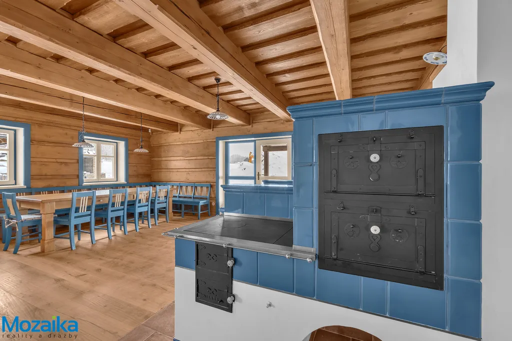 Dům bude kompletně vybaven nádherným nábytkem z masivu a kachlovými kamny, vše v mimořádné kvalitě zpracování. Použité fotografie interiéru pocházejí z již realizované a prodané stavby, přičemž v tomto domě bude místo modré barvy použita příjemná zelená. Každý kus nábytku je dílem zkušených řemeslníků, kteří dbají na detail a dlouhodobou funkčnost.