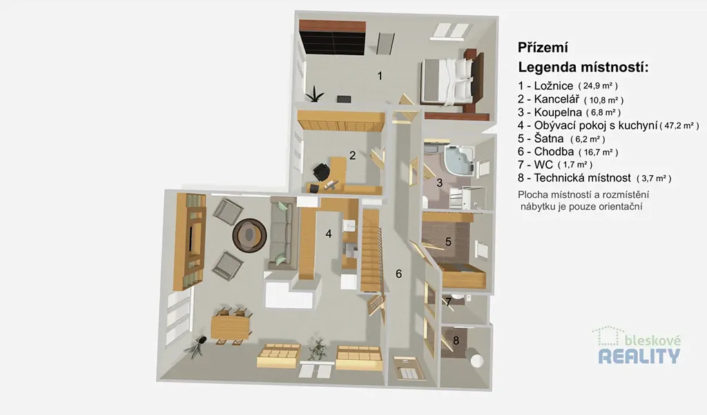Dále se zde nacházejí dva samostatné pokoje, šatna, technická místnost, koupelna s WC a další samostatné WC.
