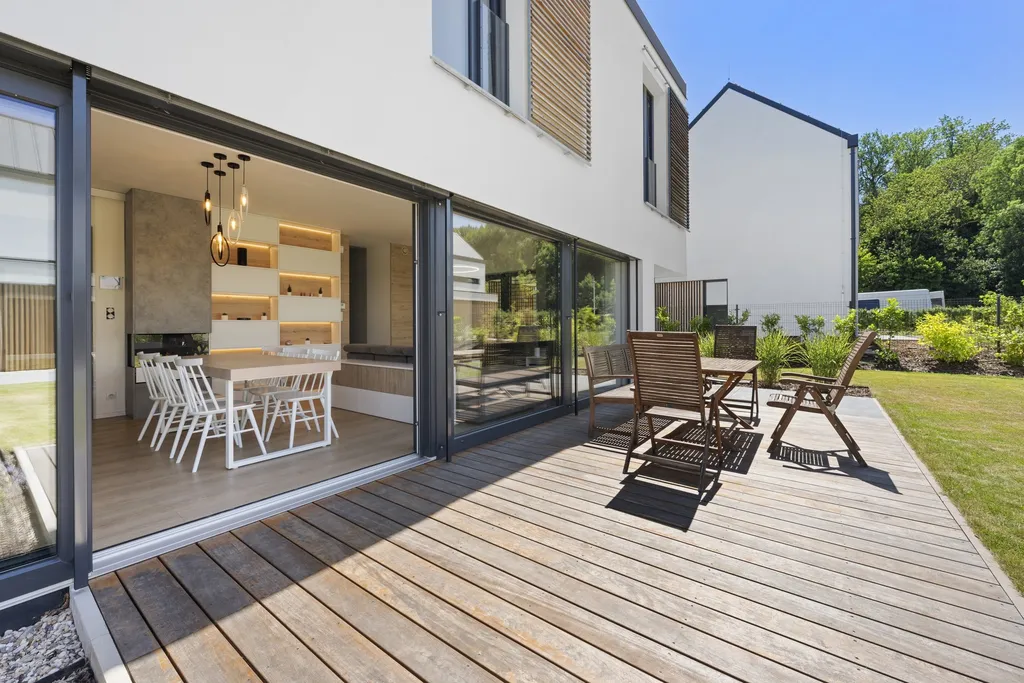Zahrada je pečlivě upravená, s okrasnými záhony a automatickým zavlažovacím systémem napojeným na nádrž na dešťovou vodu. Terasa navazující na obývací pokoj nabízí příjemný prostor pro relaxaci a posezení. K domu náleží prostorná garáž a zpevněný příjezdový prostor pro další parkování.
