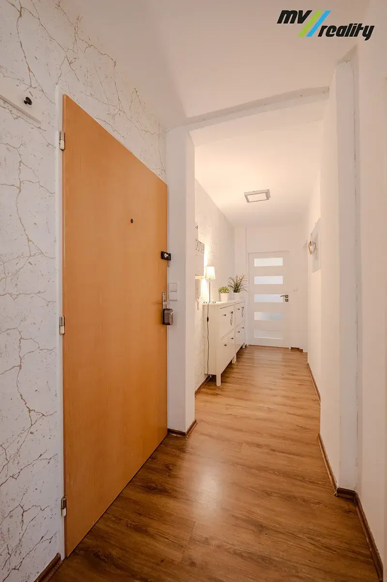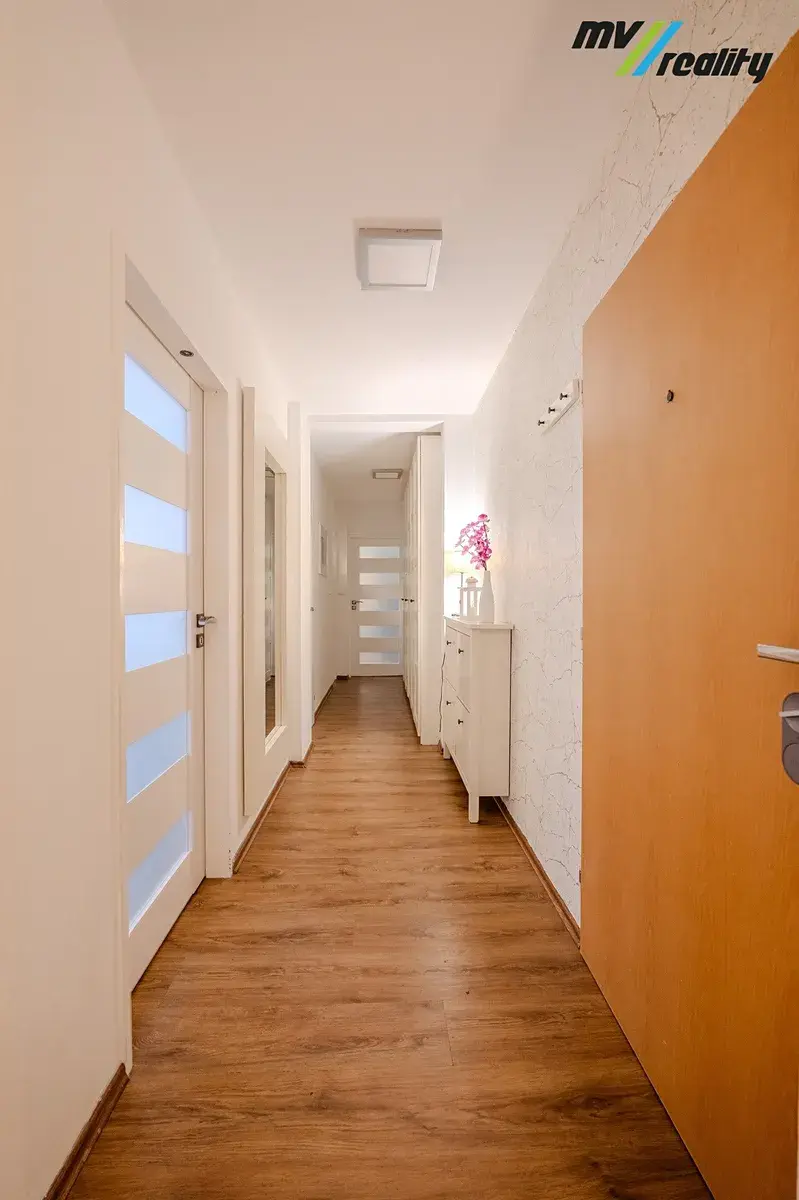 Dominantou bytu je prostorný obývací pokoj, ideální pro rodinná setkání i klidné večery. Samostatná kuchyň nabízí dostatek místa pro vaření i stolování, ložnice pak klidný prostor pro odpočinek. Velkým benefitem je samostatná technická místnost s pračkou a sušičkou, díky které zůstává byt dokonale organizovaný a bez kompromisů v úložných prostorech.