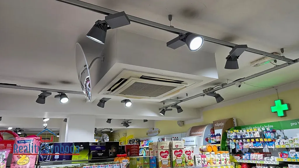 Prostor má praktické a přehledné uspořádání s jasně čitelnou prodejní plochou, kterou lze snadno členit podle potřeb konkrétního provozu.