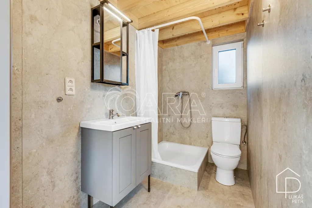 Z hlediska provedení je dům postavený poctivě a bez zbytečných kompromisů. Konstrukce i skladby odpovídají celoročnímu použití, dům dobře drží teplo a zároveň se dá rychle vytopit. Koupelna je řešená jednoduše a prakticky, s důrazem na snadnou údržbu. Fasáda je dřevěná, střecha má klasickou taškovou krytinu.