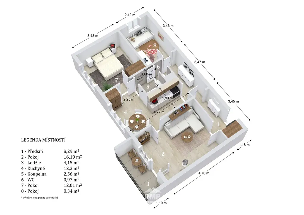 Jednotlivé výměry místností: kuchyně - 12,3 m², obývací pokoj - 16,19 m², pokoj - 12,01 m², pokoj - 8,34 m², koupelna - 2,56 m², samostatné WC - 0,97 m², předsíň - 8,29 m², lodžie - 4,15 m², sklepní kóje - 1,39 m².