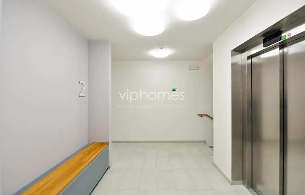 Interiér bytu, dispozice 2+kk, situovaného ve 2.patře novostavby, tvoří komfortní obývací pokoj s plně vybavenou kuchyní, (mikrovlnná trouba, myčka nádobí, lednice s mrazákem), ložnice orientovaná do upraveného vnitrobloku, koupelna (vana, sprchový kout, toaleta), balkon, vstupní hala.Vestavěné skříně v chodbě a v ložnici, pračka.