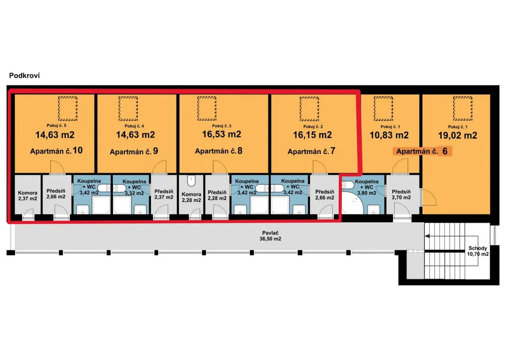 Ke každému apartmánu je vstup z venkovní kryté pavlače, která umožňuje pohodlný přístup i za nepříznivého počasí. Každá jednotka má vlastní koupelnu s WC, vytápění, televizi a okna zajišťující dostatek denního světla.