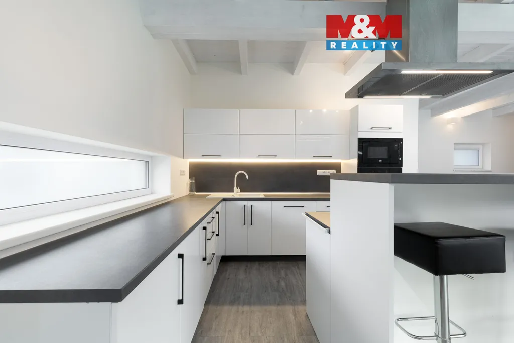 Interiér nabízí vzdušný prostor s moderní kuchyní včetně jídelní části, obývací pokoj, ložnici s vestavěnou skříní a dětský pokoj.
