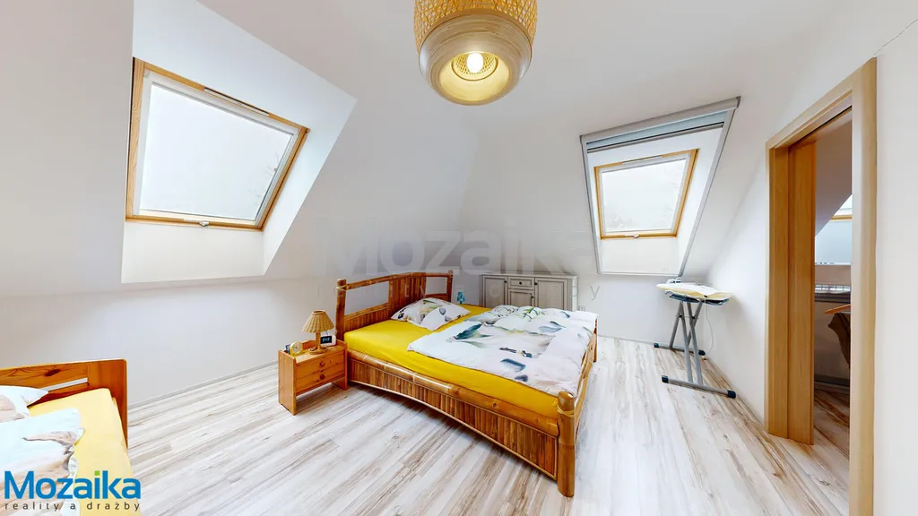 V podkroví (2. NP) se nachází chodba, ložnice, šatna, další pokoj, koupelna, samostatné WC a pracovna, která je přístupná přes garáž a nabízí tak možnost využití např. pro kancelář, služby apod. Dům tak nabízí dostatek soukromí pro každého člena rodiny.