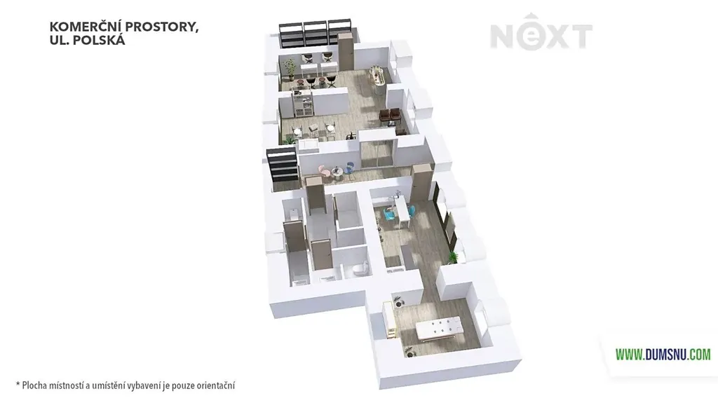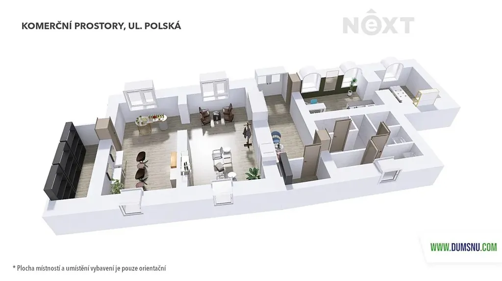 Dispozice prostoru je prakticky řešena. Ze společné chodby je přístup do sociálního zázemí a dále přes uzamykatelné prosklené dveře do dvou propojených místností. V jedné z nich je mini kuchyňka chytře vestavěná do skříně. Z těchto místností se dále vstupuje do menší samostatné místnosti, kde je umístěn trezor ve zdi.